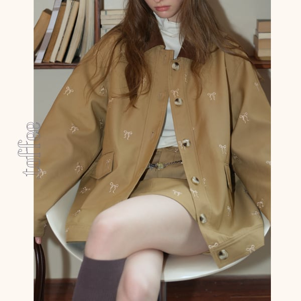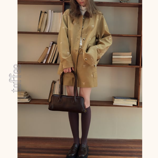 さりげないリボン刺繍が可愛らしいオーバーサイズジャケットとミニスカートのセットアップ。