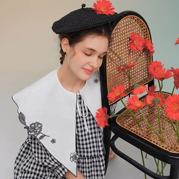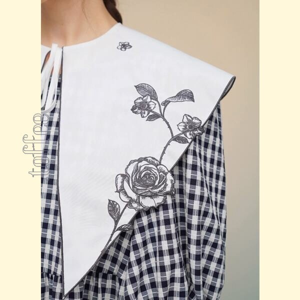 エレガントなガーリーテイストを引き立てるこのつけ襟は、繊細なバラの刺繍が施されたユニークな形が特徴です。