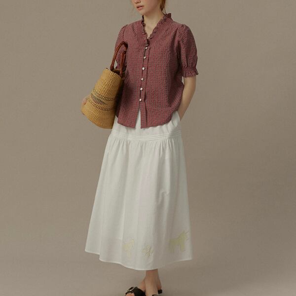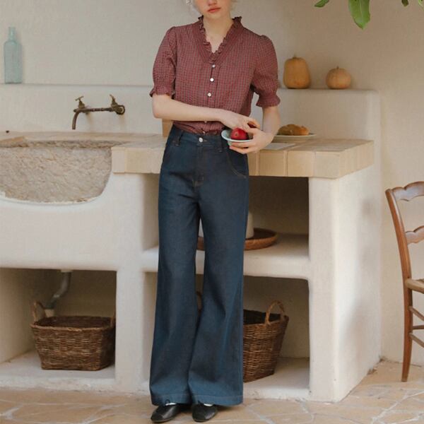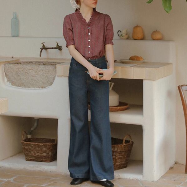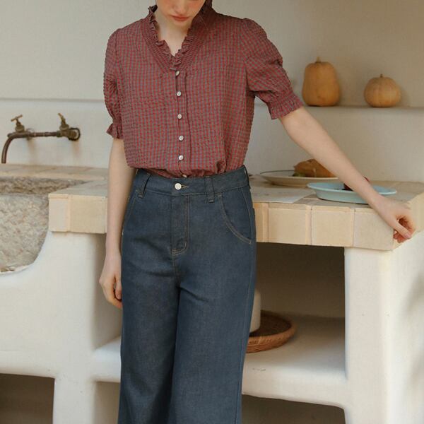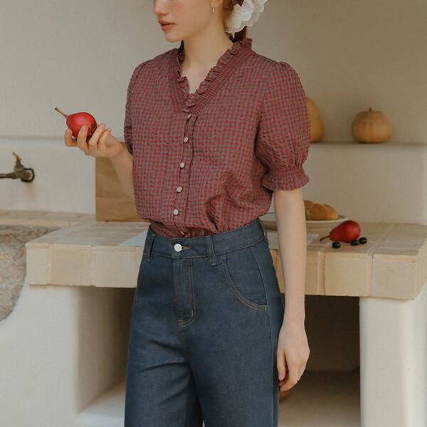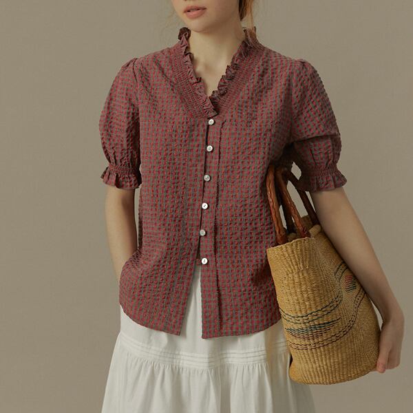 "ふんわりとしたシルエットが魅力のフリルネックチェック柄ブラウス。