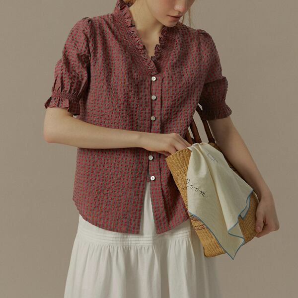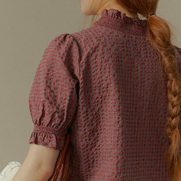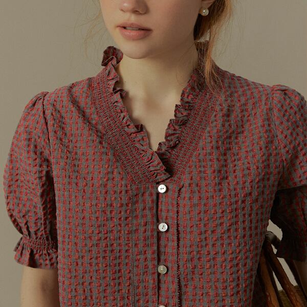 フリルネックチェック柄ブラウス《Z00822》