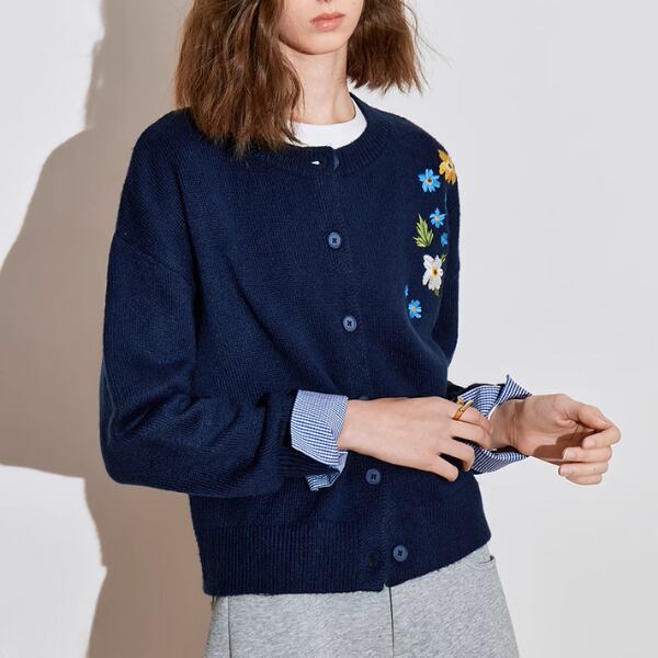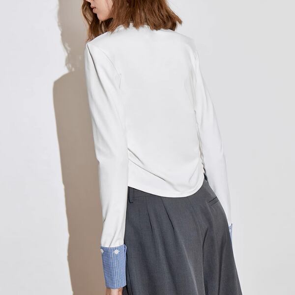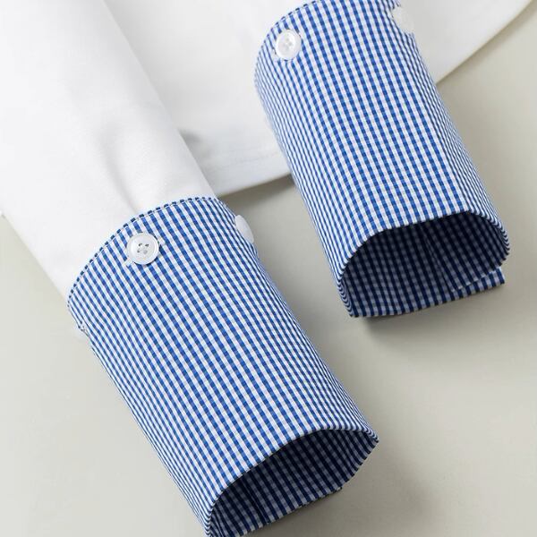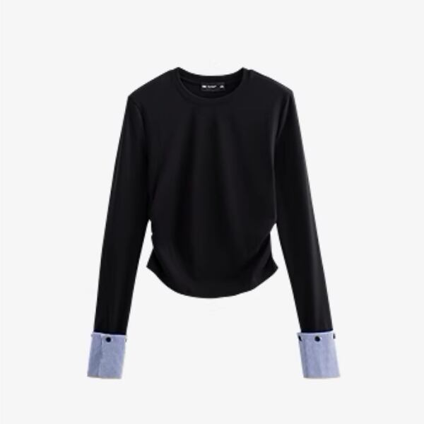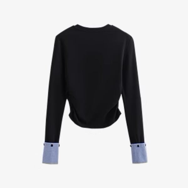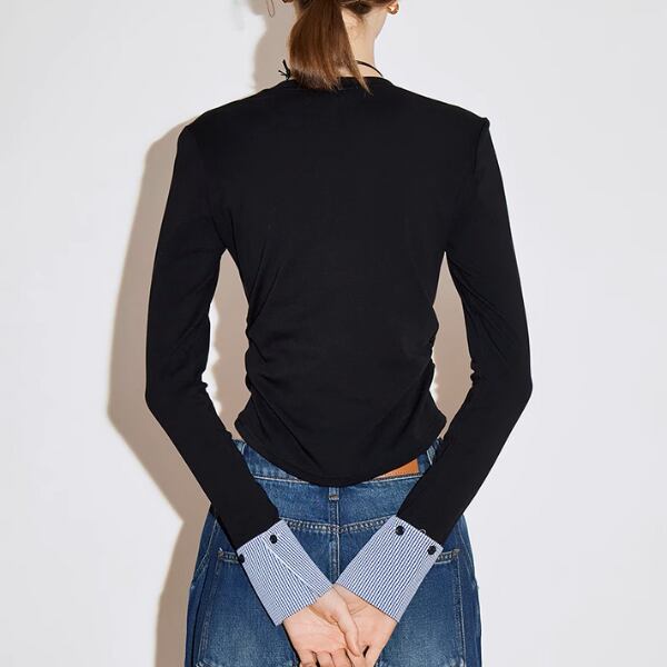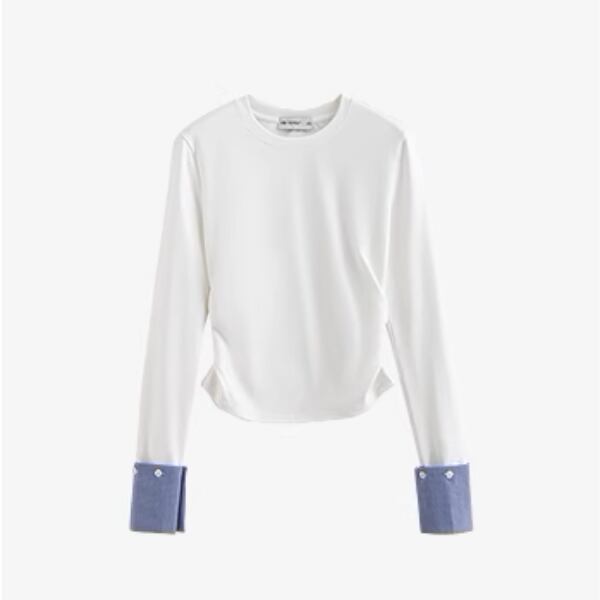クルーネックのシンプルなトップスでありながら、カフス部分のギンガムチェックがさりげないアクセントになっています。