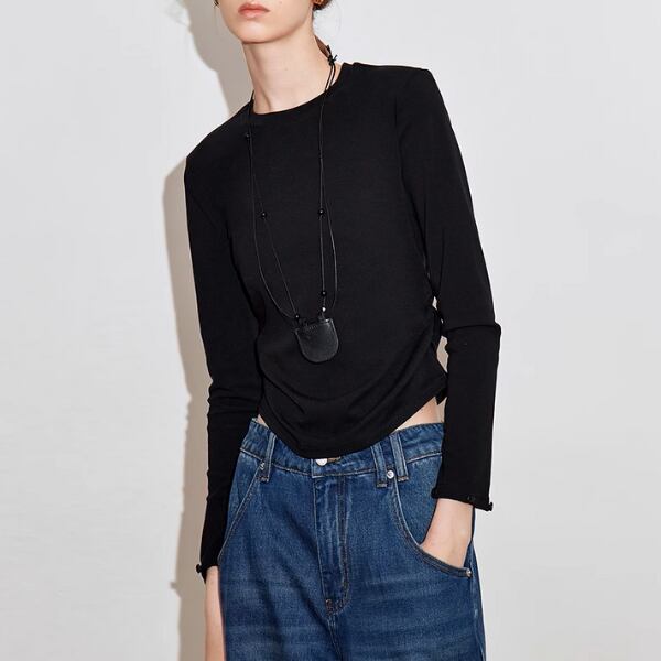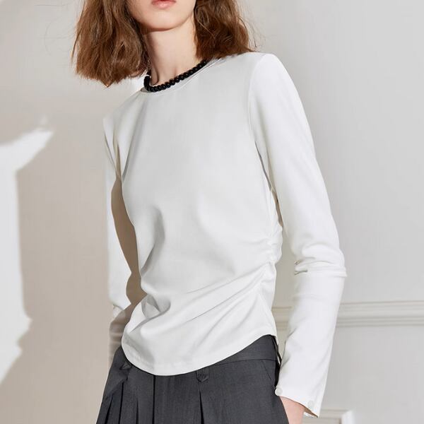 ボディはすっきりとしたシルエットで、様々なボトムスと合わせやすく、オンオフ問わず活躍します。
