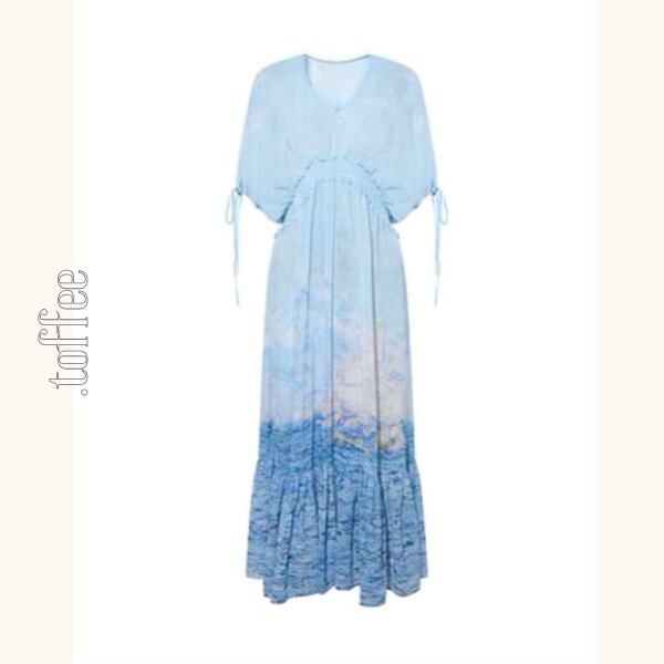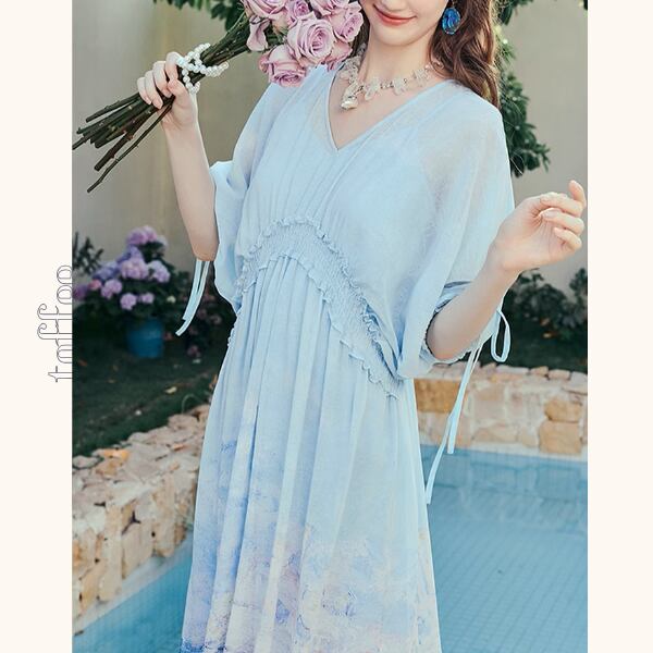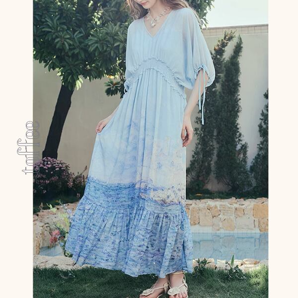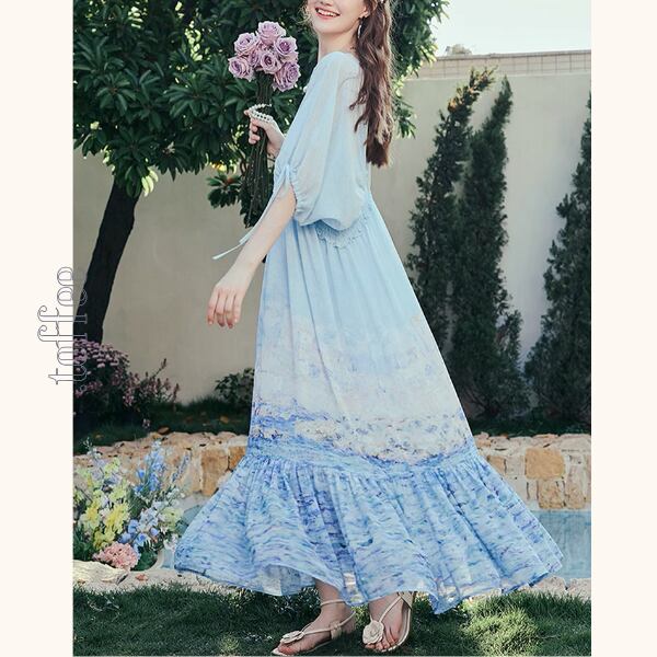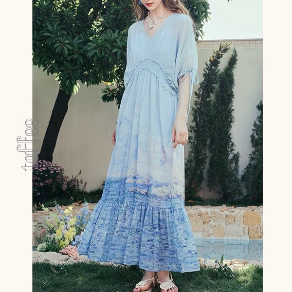 柔らかな色合いの淡いプリントが施されたロングティアードマキシワンピース。爽やかなブルーベースのデザインは、軽やかで女性らしい印象を与え、春夏のコーディネートにぴったりです。エレガントなティアードデザインが動くたびに揺れ、視線を集めること間違いなし。シンプルなサンダルやスニーカーと合わせるだけで、リラックスした印象を楽しむことができます♡