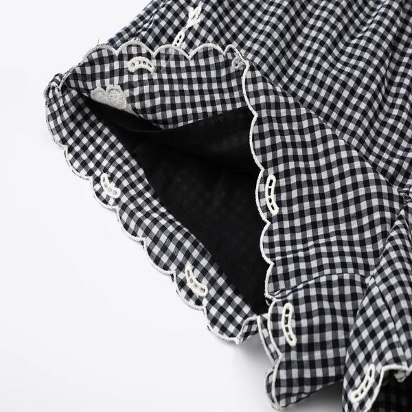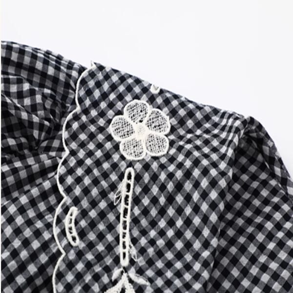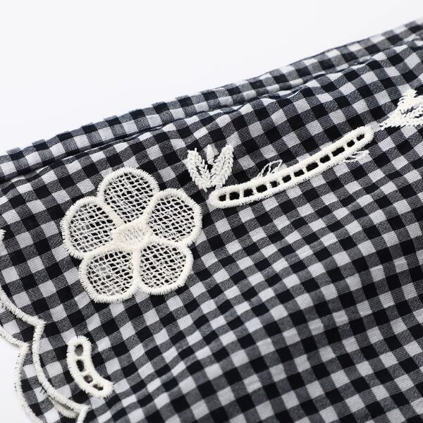 モノトーンのギンガムチェックに、繊細なフラワー刺繍を散りばめたブラウスとショートパンツのセットアップ。ブラウスは一枚でレディに、ショートパンツは軽快でいて上品。セットで着れば、レトロ可愛い雰囲気の完成です。日常にそっと華を添える、そんな特別感のある装いをお楽しみください。