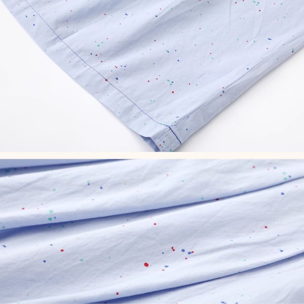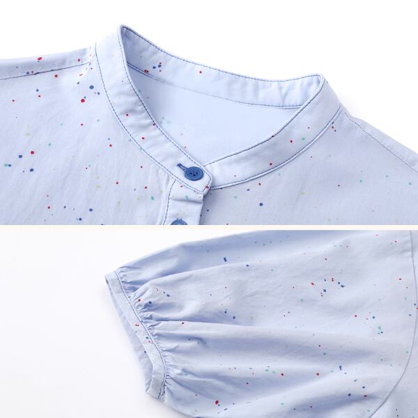 まるで水彩絵の具が跳ねたようなカラフルなドット模様が、控えめながらも心くすぐるデザイン。胸元の丸いポケットやブルーのボタンなど、細部にもレトロな遊び心を忍ばせました。ベーシックでありながら、少しだけ“自分らしさ”を加えたい女性にぴったりな一着です。ナチュラルで軽やかな印象を纏って、お出かけや日常に彩りを♡