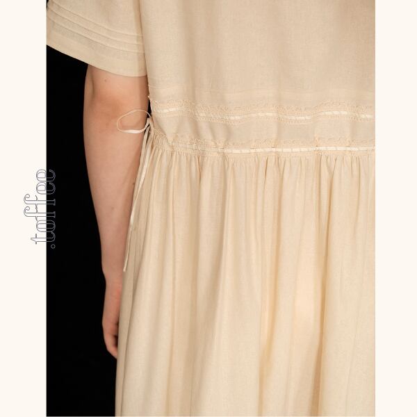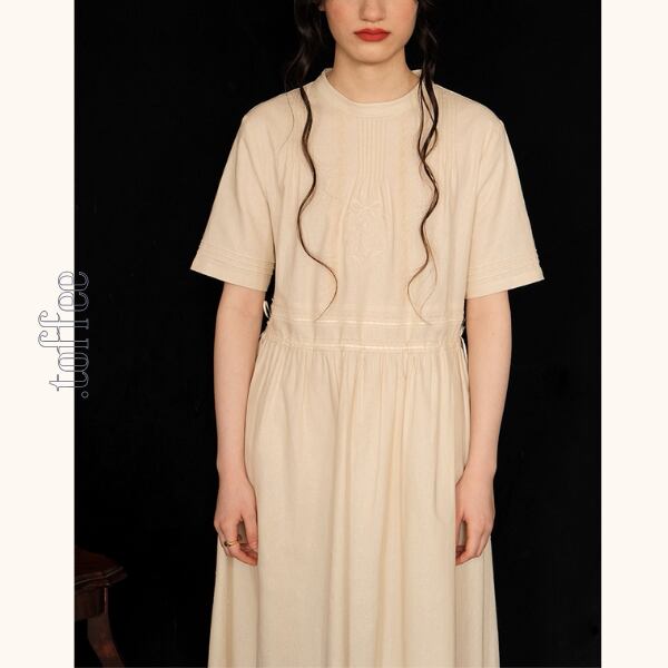 控えめな甘さが大人にちょうどいい、リボン刺繍とプリーツディテールが美しいミルキーベージュのワンピース