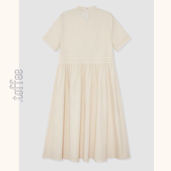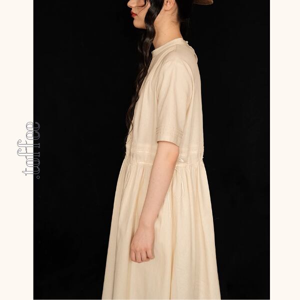 ウエストのさりげないギャザーとリボンステッチが、クラシカルな雰囲気の中に可憐さをひとさじ添えています