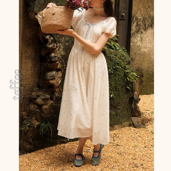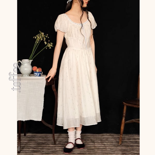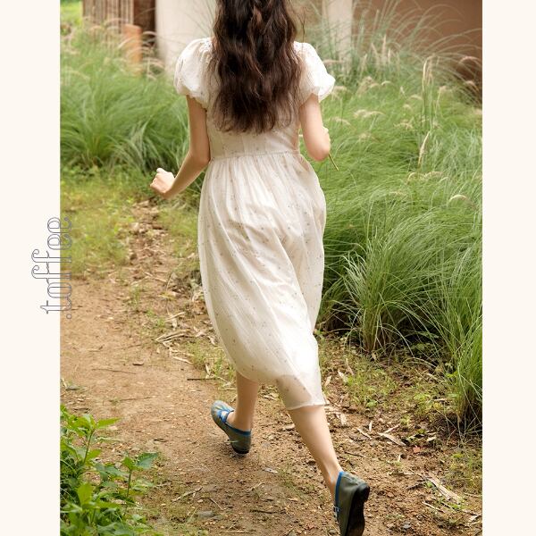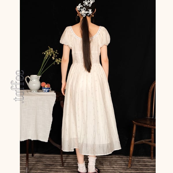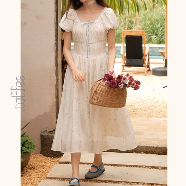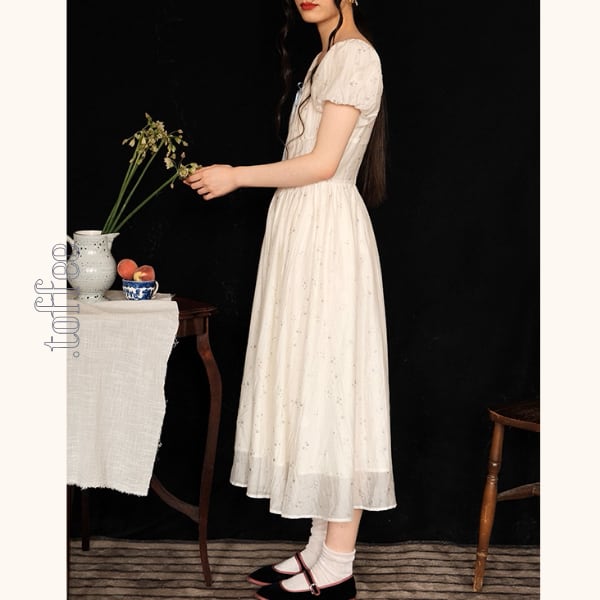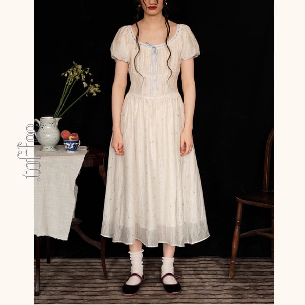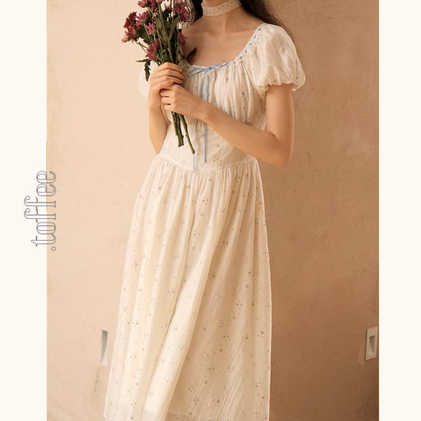 透明感あふれるシアー素材に、小さな星々をちりばめた大人のためのロマンティックワンピース。ふんわり丸みを帯びた袖が柔らかさを引き立て、胸元のブルーリボンがそっと甘さを添えます。