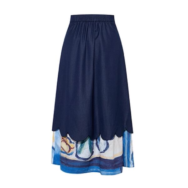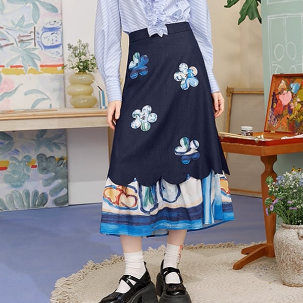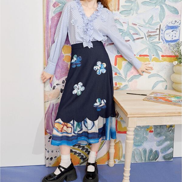 大胆な花柄刺繍と、裾に広がるアートのようなレイヤードデザインが目を惹く一枚。ネイビーを基調とした落ち着いたカラーに、スカラップカットや多彩な配色が映え、ベーシックでありながら“ちょっと個性”を楽しめる仕上がりです。動くたびにゆらめくシルエットは、大人女性の装いに遊び心と品をプラス。いつものコーデに、物語の1ページのような彩りを──。レトロとモダンを融合させた世界観を感じていただけます。