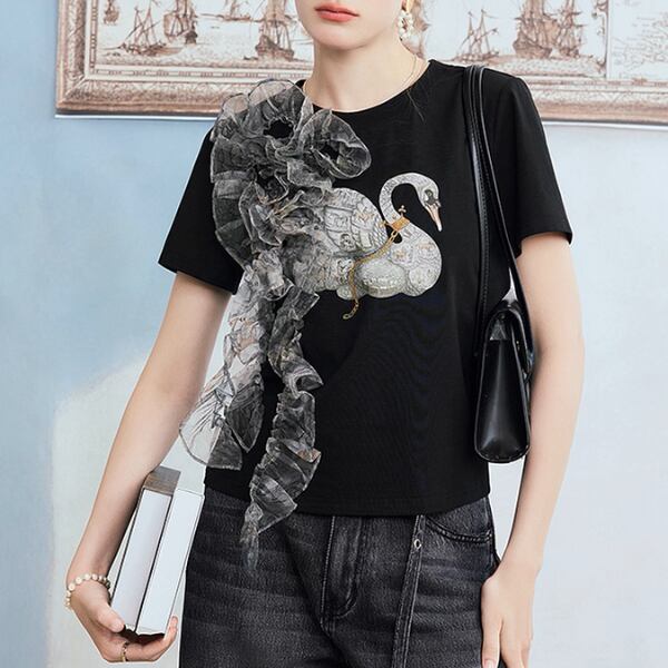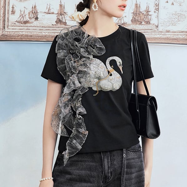 チュールリボンと水鳥プリントのブラックTシャツ《Z01060》