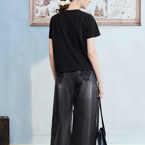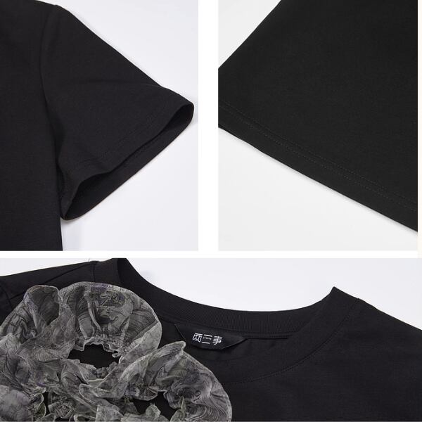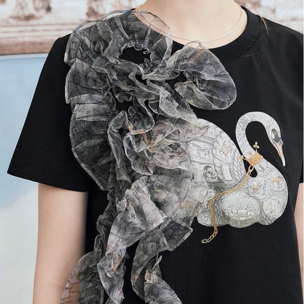 優雅な水鳥のプリントと、アシンメトリーに流れるチュールリボンが印象的なブラックTシャツ。落ち着いたモノトーンの中に、個性と可憐さを秘めた一着です。立体的なチュールは動くたびにふわりと揺れ、まるで詩的な物語の一幕のよう。