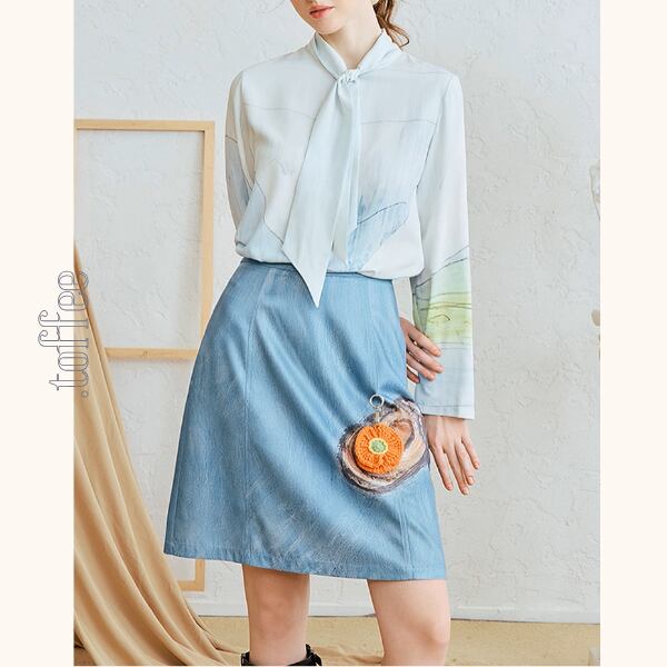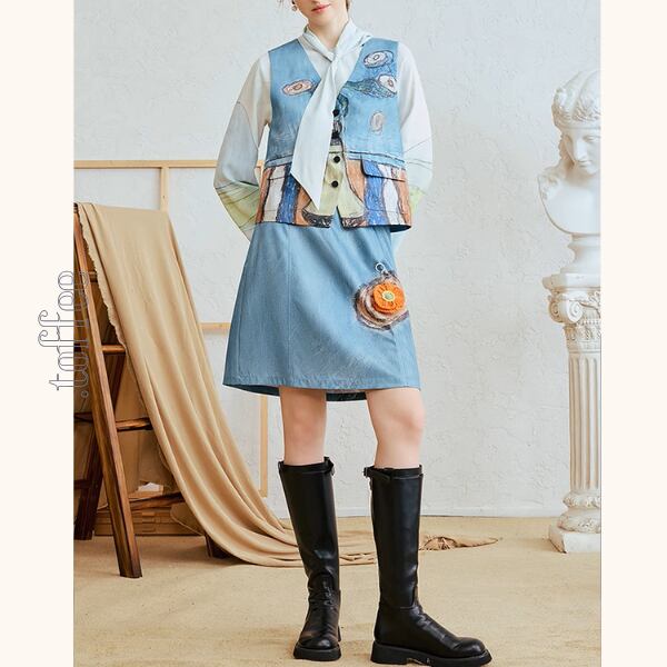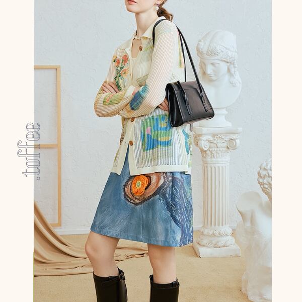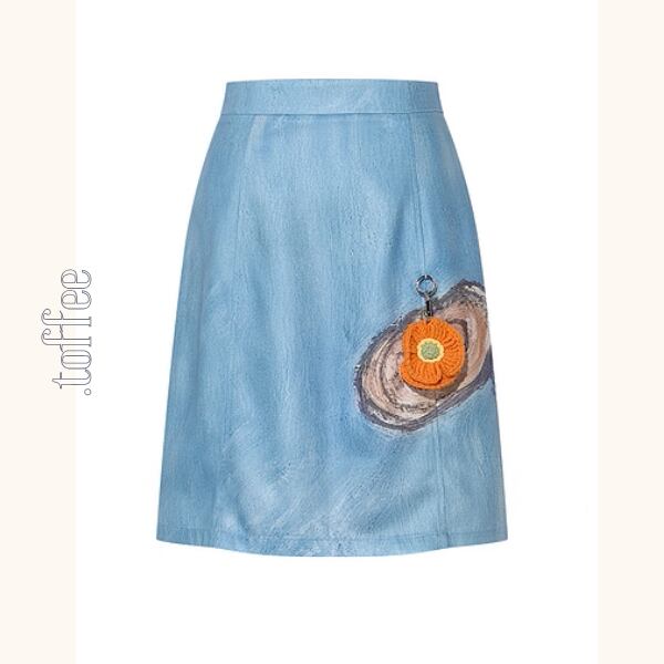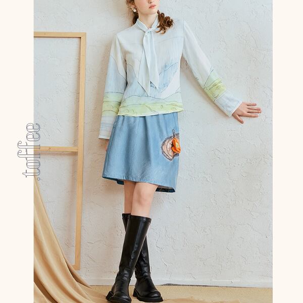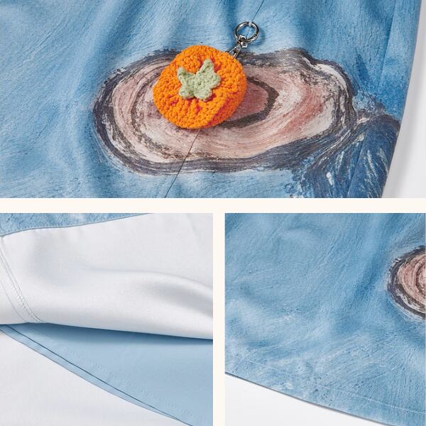 印象的なバックスタイルが魅力のショートスカート。後ろには幻想的なアート風プリントが施され、歩くたびに視線を集めます。フロントには不思議な“切り株の絵”と、オレンジの編みチャーム付き。ベーシックな台形シルエットだから着回しやすく、ブラウスやニットとも相性抜群。シンプルな日常に、ちょっぴり個性とレトロな可愛さを添えてくれるアイテムです。