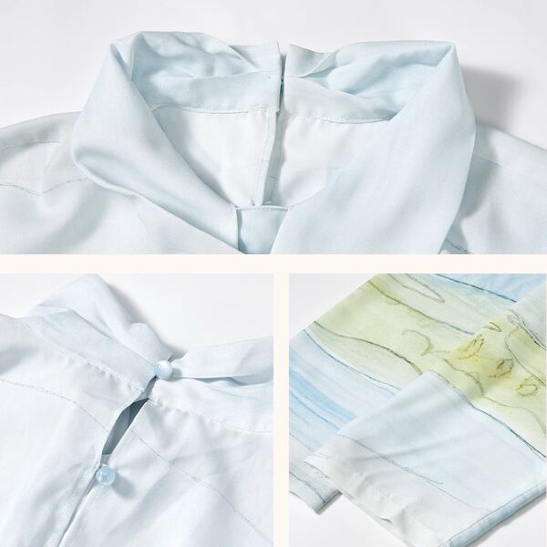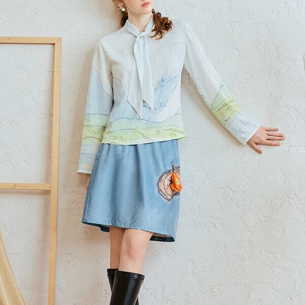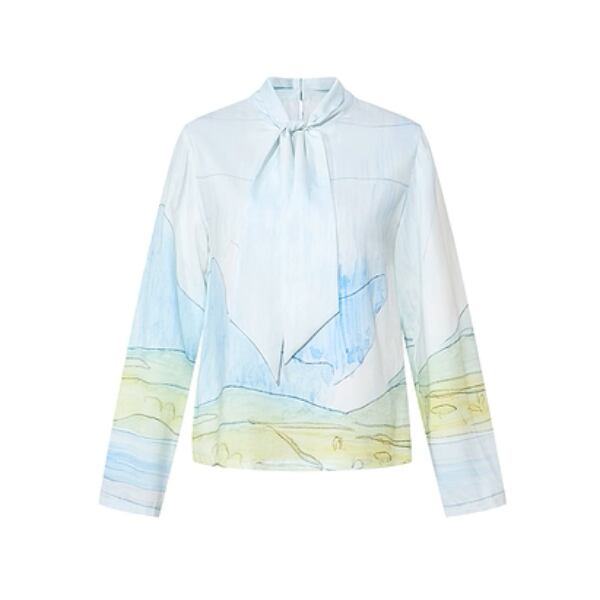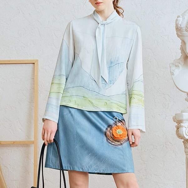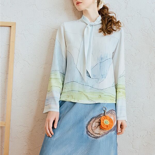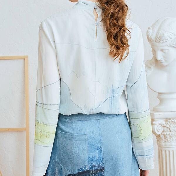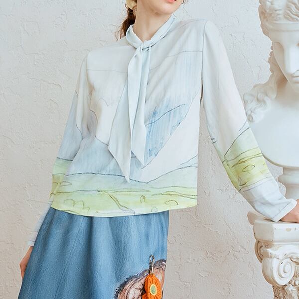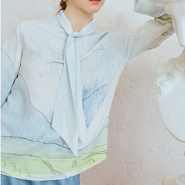 まるで一枚の風景画を身に纏うような、アートタッチのプリントが印象的なデザインシャツ。