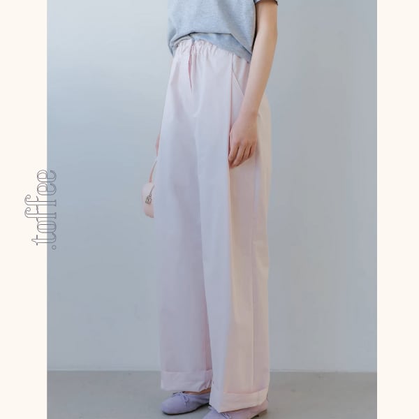 毎日履きたくなる心地よさ。ほんのりピンクが優しい印象のワイドパンツは、くしゅっとしたウエストゴムがさりげないアクセントに。リラックス感たっぷりのシルエットながら、足元にかけてのすっきり感で大人の女性にもぴったり。Tシャツやブラウスとも好相性で、オフィスカジュアルにも週末コーデにも活躍します。