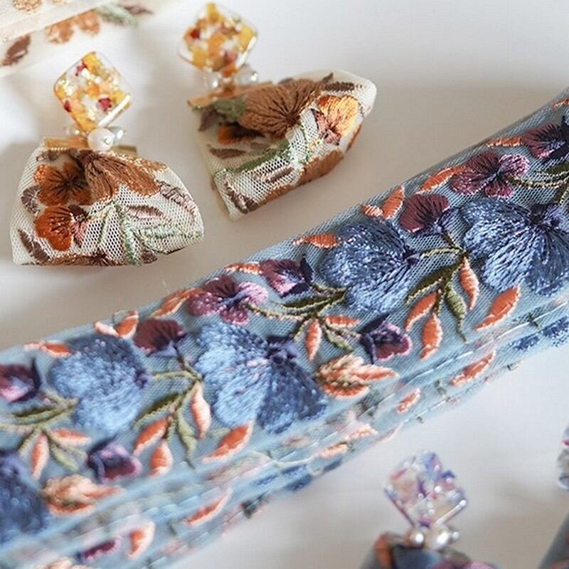 本物のプリザーブドフラワーとリボンに施された刺繍の花が可憐なイヤーアクセサリー