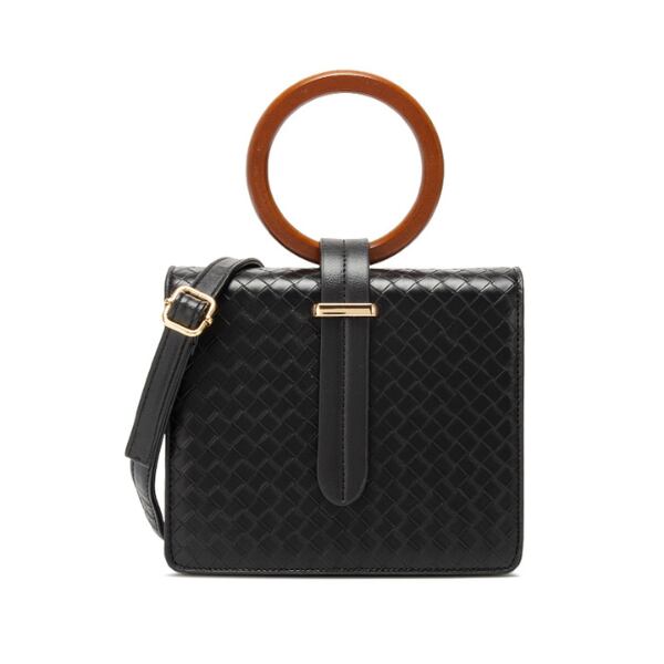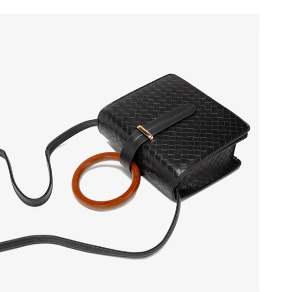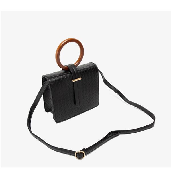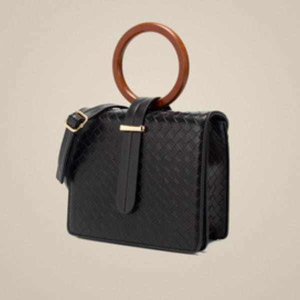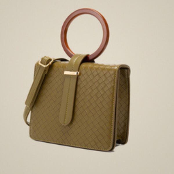 サークルのウッドハンドルがアクセントになったスクエアバッグです。