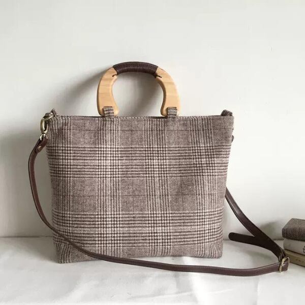 ウッドハンドルチェック柄バッグ w-054