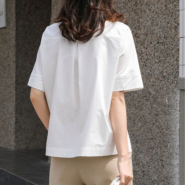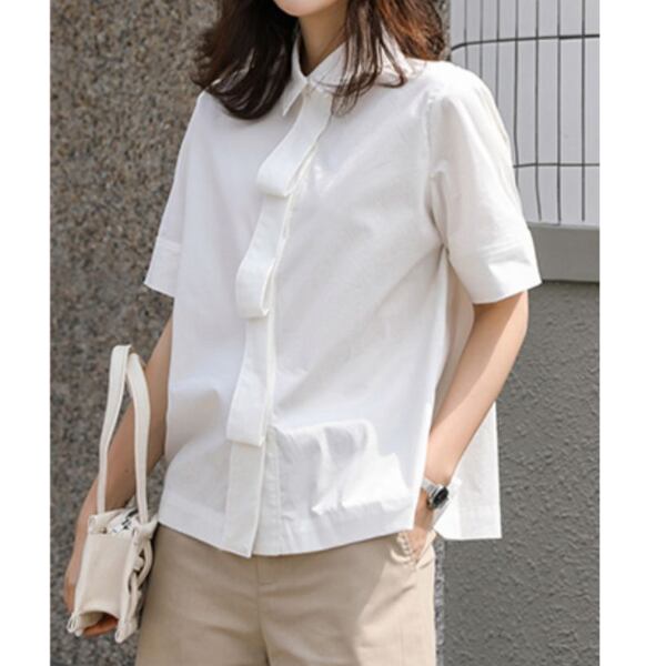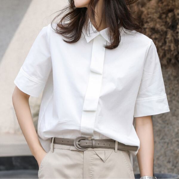 ゆるやかにプリーツを寄せたような胸元のデザインがポイントのシャツ。
