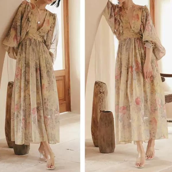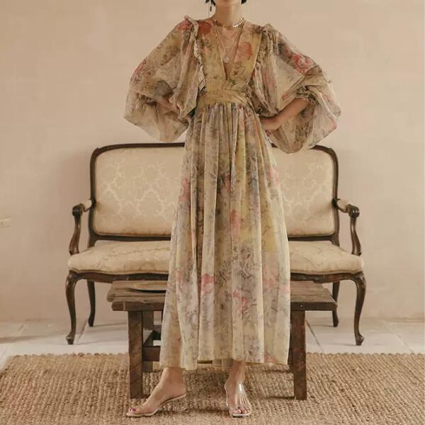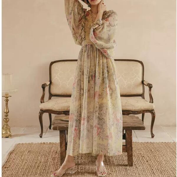 フラワープリントボリュームスリーブワンピース X-046