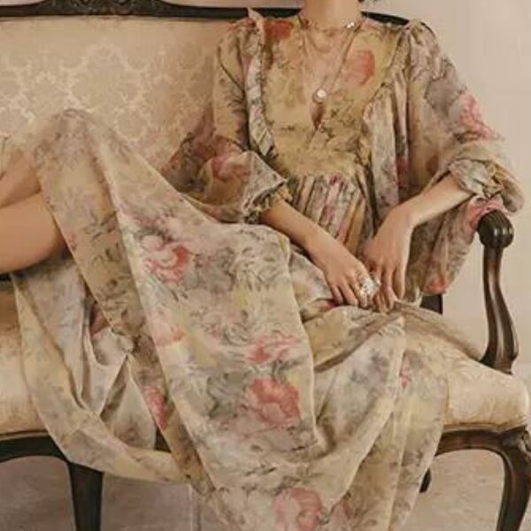 ヴィンテージのような、くすんだ色味のフラワープリントワンピース。