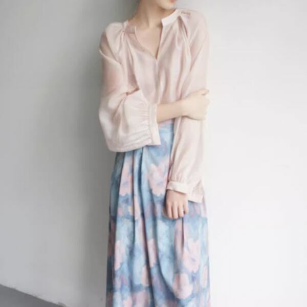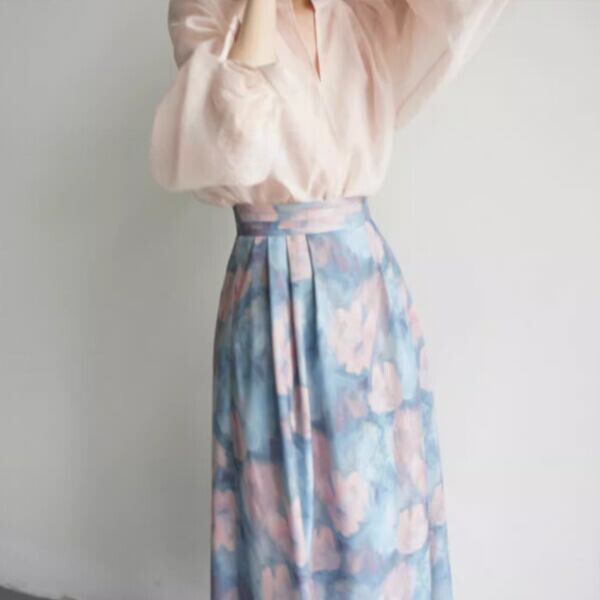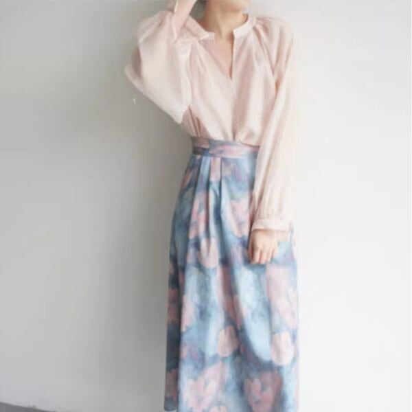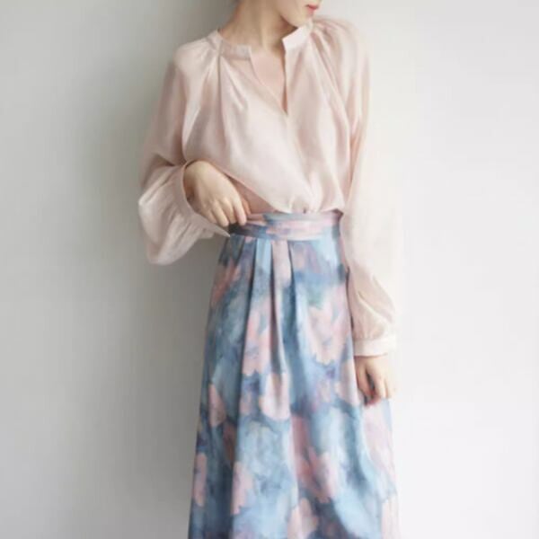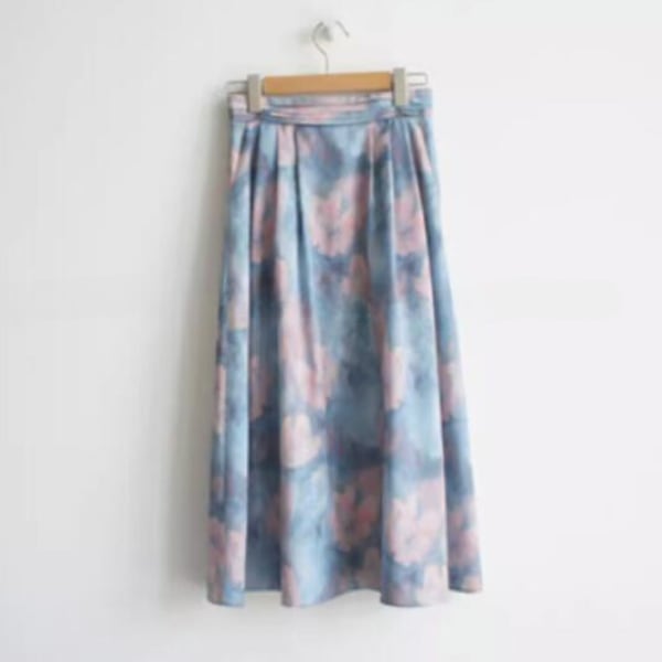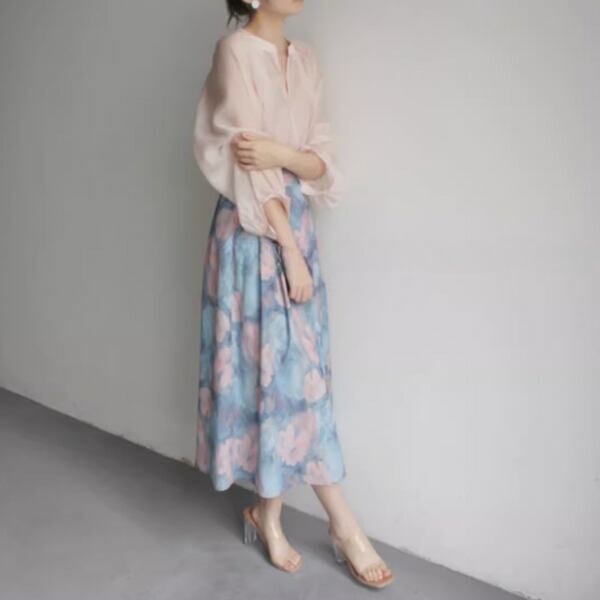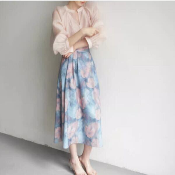淡い色合いで繊細なデザインが特徴的なスカートです。