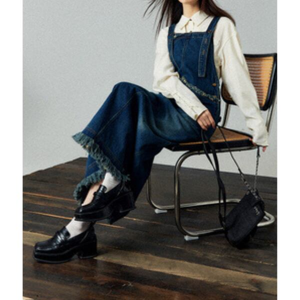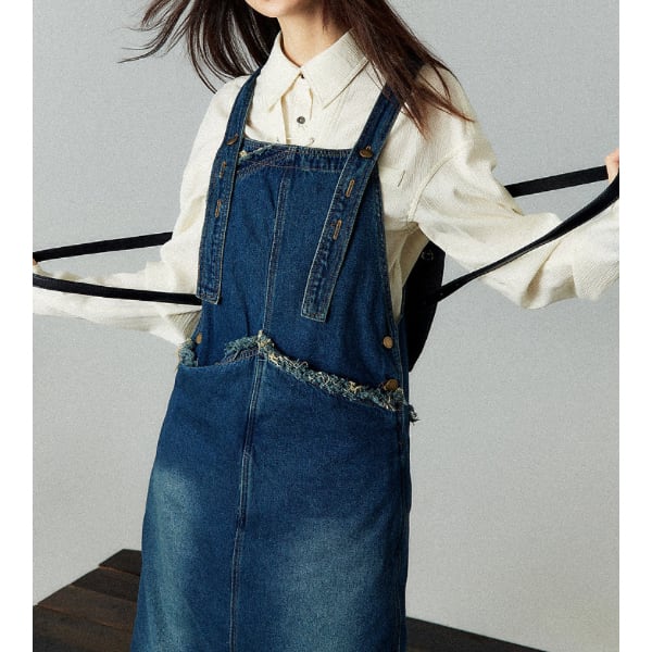 ウエストの切り替えと裾をフリンジで仕上げたデニムのジャンパースカートです。