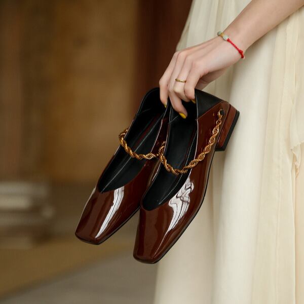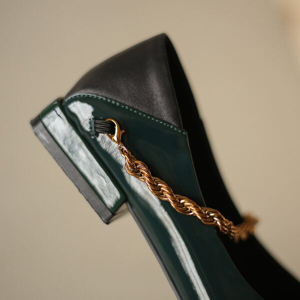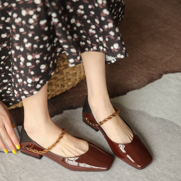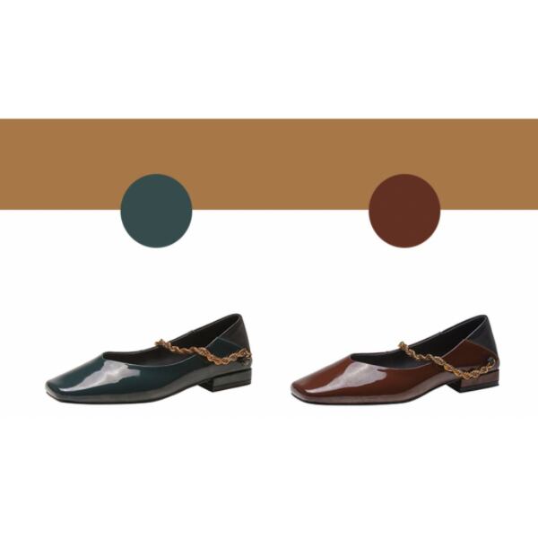 【2color】パテントレザーチェーンローヒールパンプス X-370