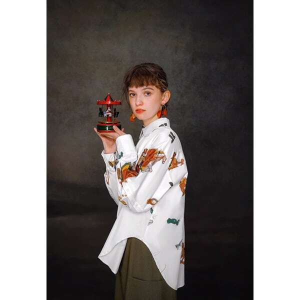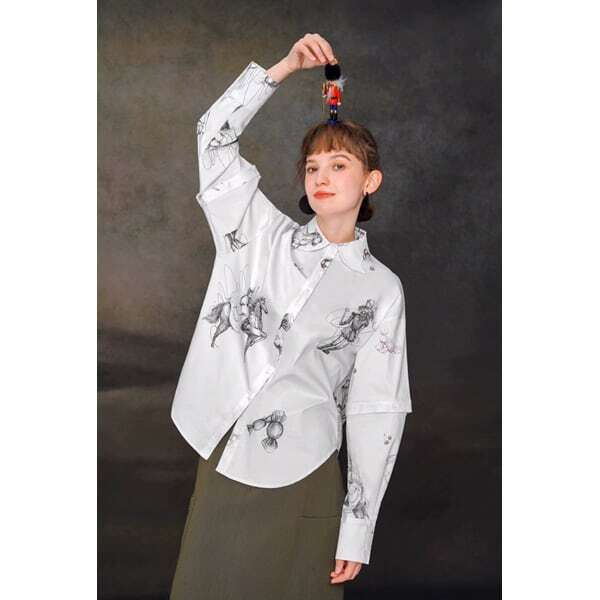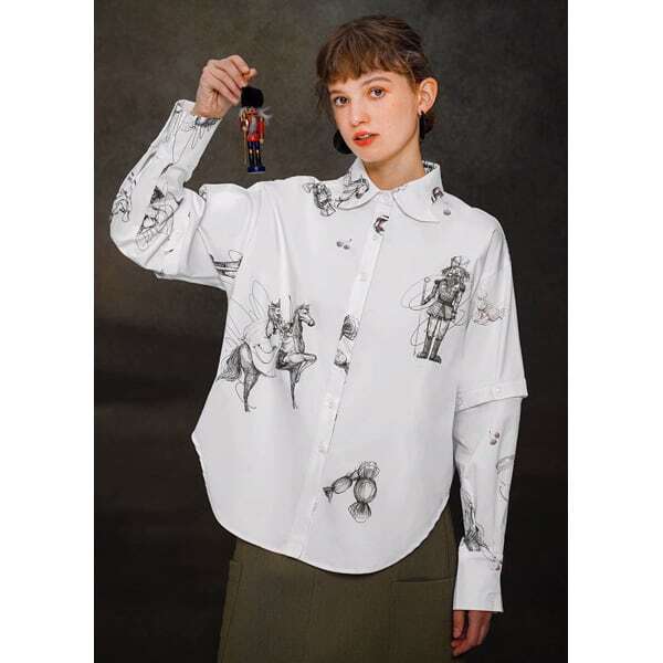 くるみ割り人形イメージ柄のシリーズのシャツブラウス。柄はもちろんのこと、襟先デザインや袖の着脱可能なボタンデザインまで抜かりなくおしゃれ!!バックのタックと裾のラウンドヘムデザインが立体感のあるシルエットを演出してくれます。