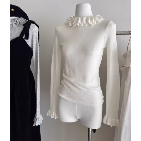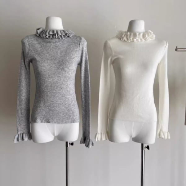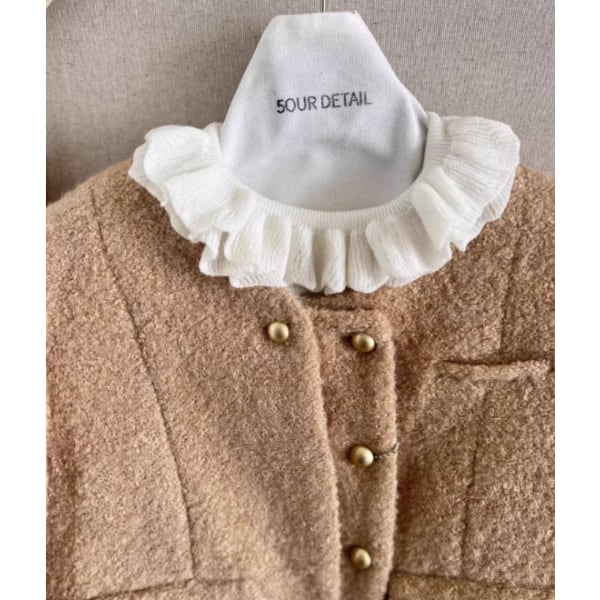 フリルのネックラインと袖口がフェミニンな雰囲気をプラス。