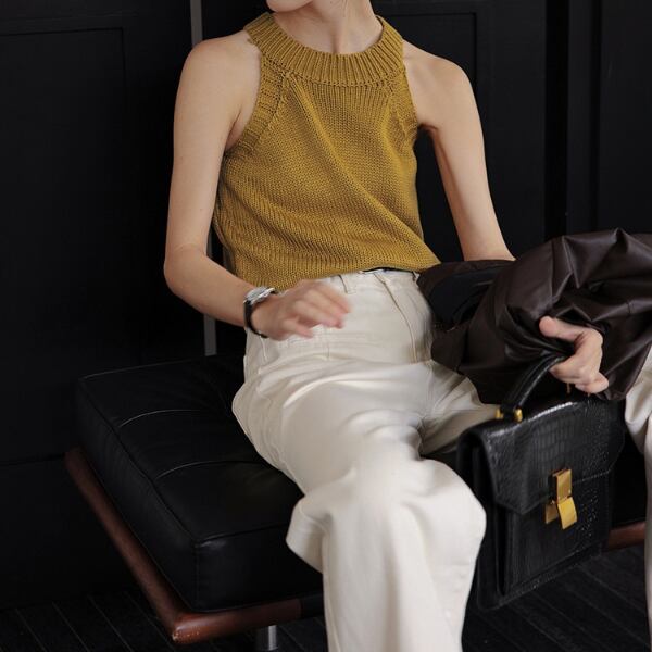 ホルターネックが上品な印象を与え、女性らしいシルエットを演出するノースリーブトップス。