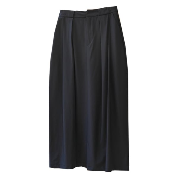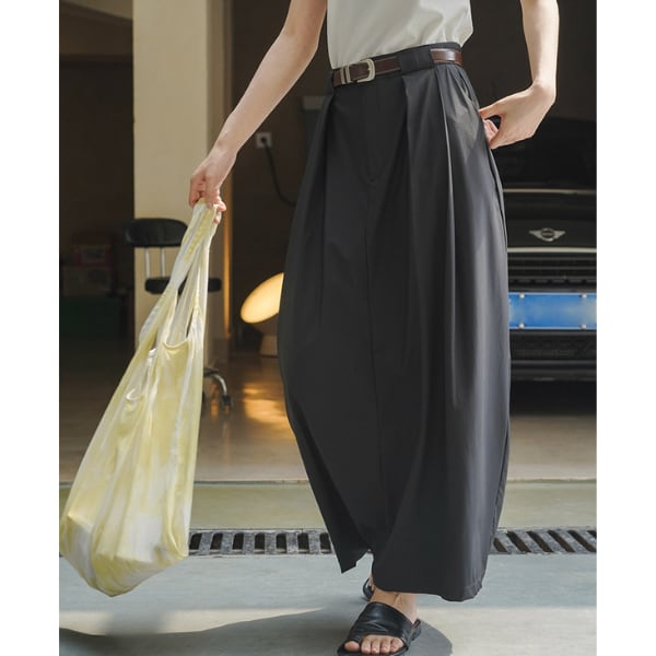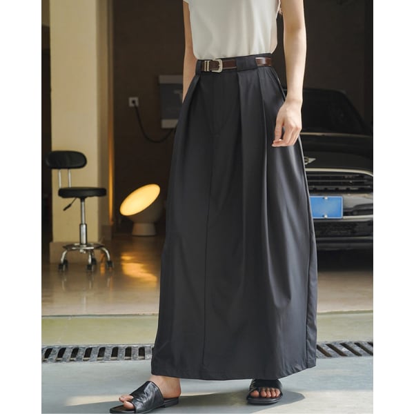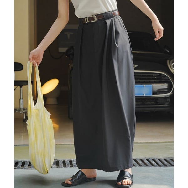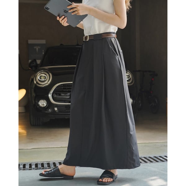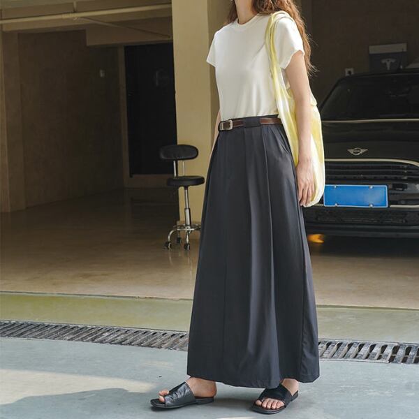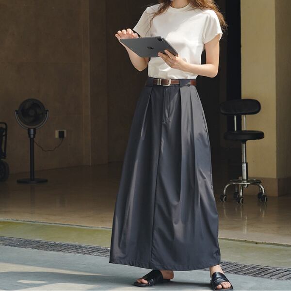 シンプルでエレガントなブラックのハイウエストドレープロングスカート。