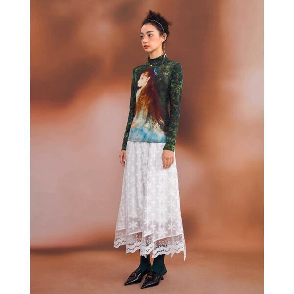 ロマンティックで甘くなりがちな印象派の名画を、エッジの効いたデザインのハイネックカットソーに落とし込む事により独特でアーティスティックな印象に。