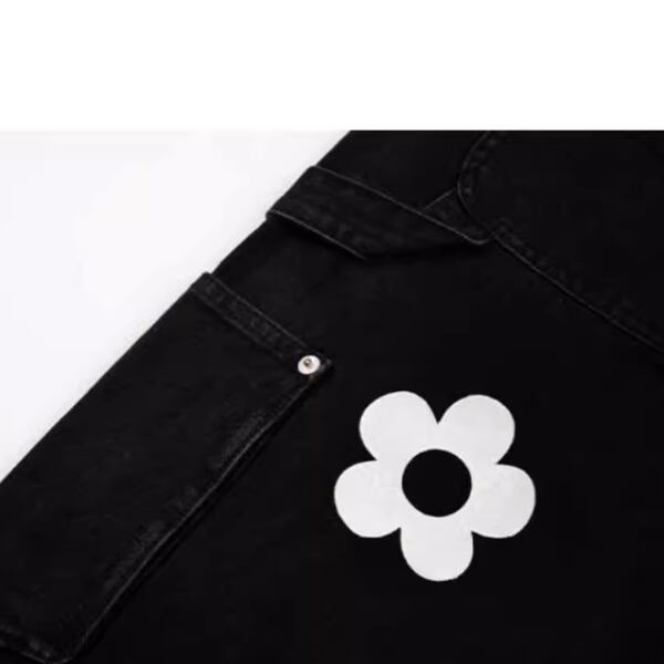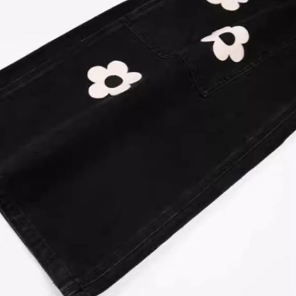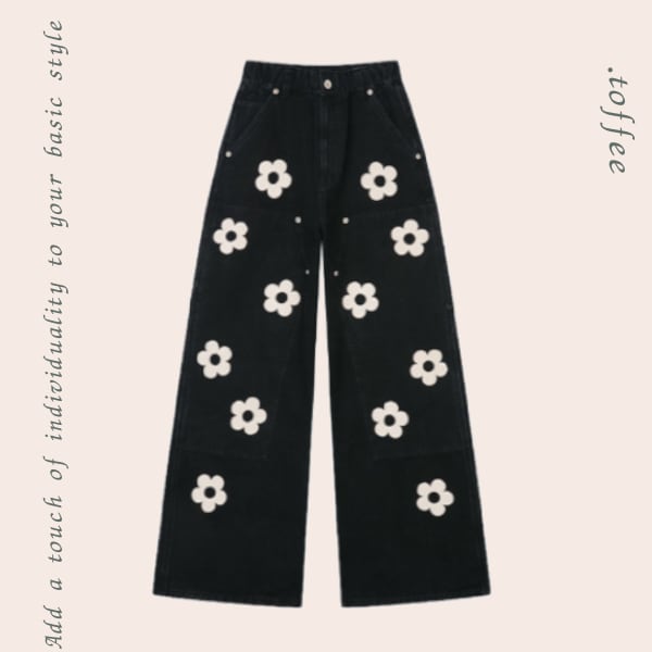 可愛らしいフラワーアップリケが施されたブラックワイドデニムパンツ。