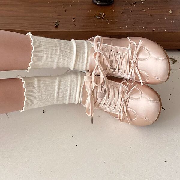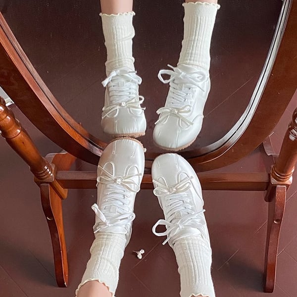 両足分に可愛らしい小ぶりな蝶結びのリボンが配されており、紐を結べば一足で4つのリボンが完成する独特のデザインです。