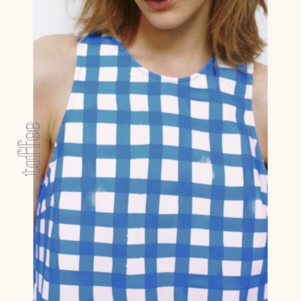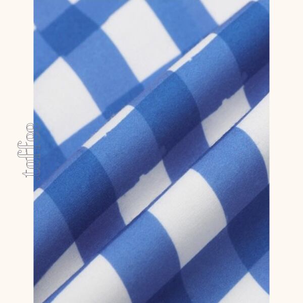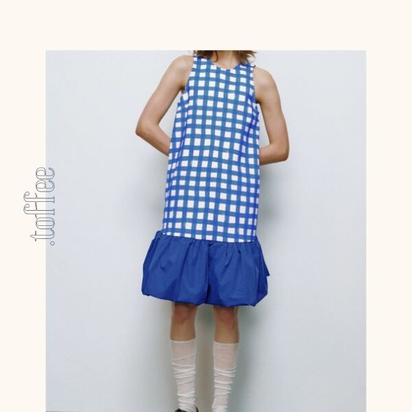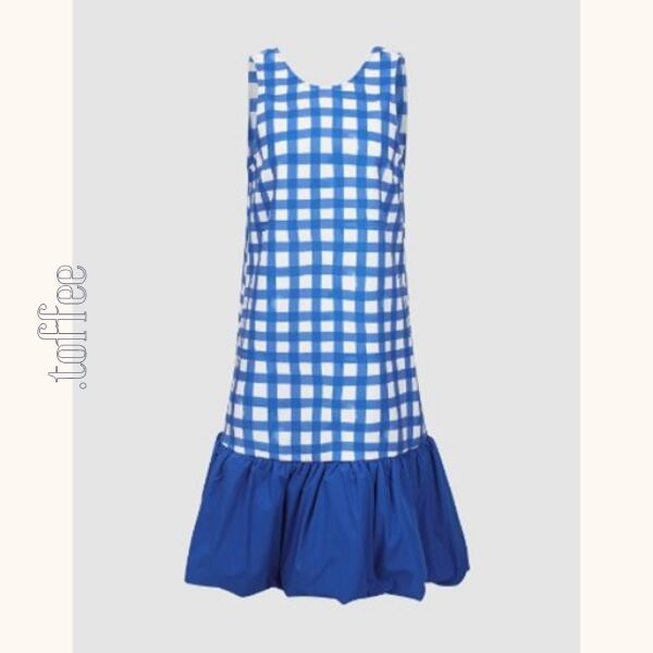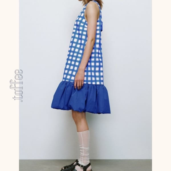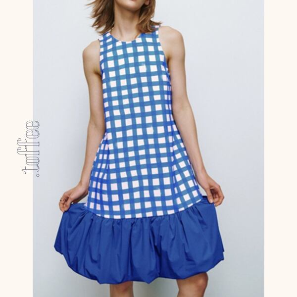 チェック柄の切り替えがポイントのバルーンワンピース。爽やかなブルーが存在感を与え、ふんわりとしたシルエットが女性らしさを引き立てます。清涼感をプラスしてくれる、暑い季節に大活躍の一枚です。