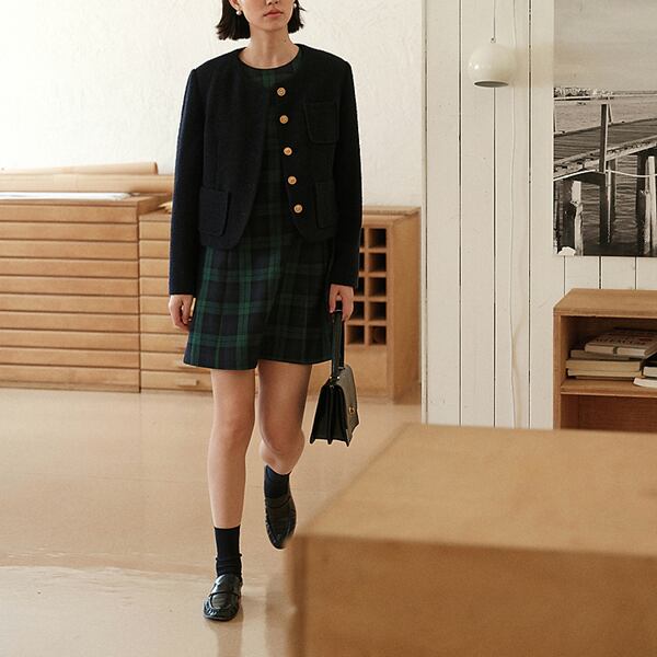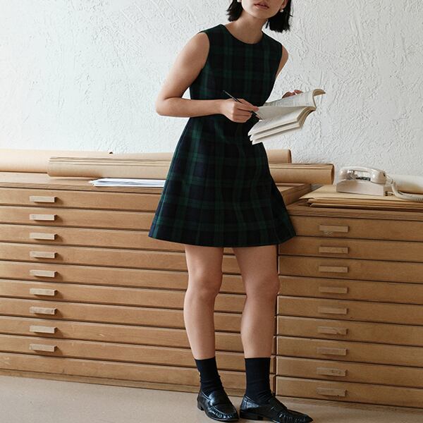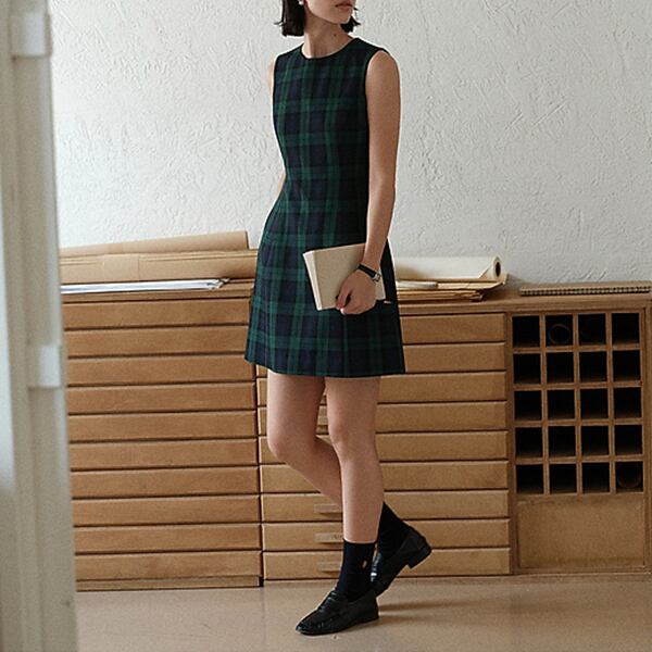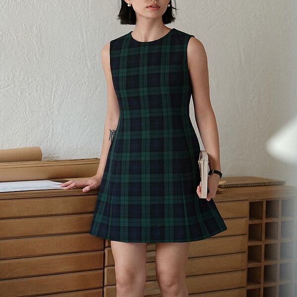 身に着けるだけで存在感を放つノースリーブミニワンピース。シックで上品なダークグリーンのタータンチェック柄が、大人の女性にぴったり。ワンピース一枚でコーデを完成させられる便利さも魅力のひとつです。