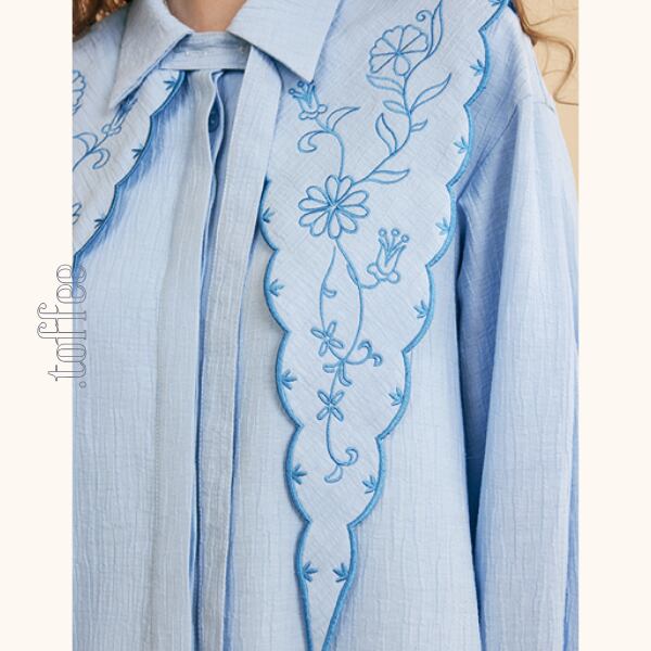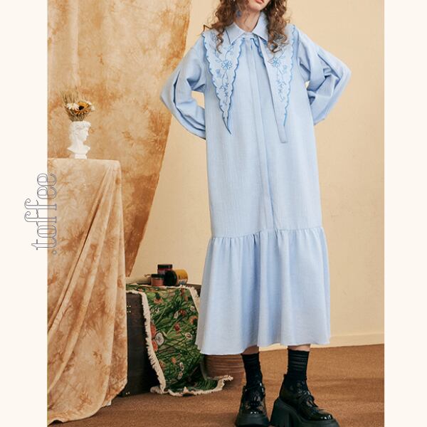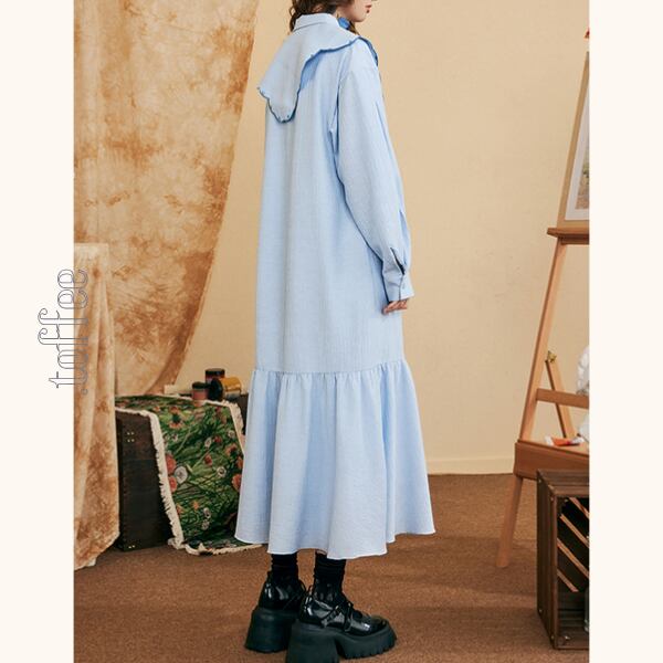 取り外し可能な大きな襟が魅力のこのワンピースは、ロング丈のスタイリングに抜群の華やかさをプラスします。