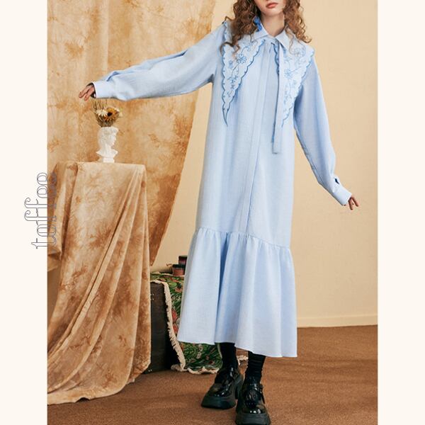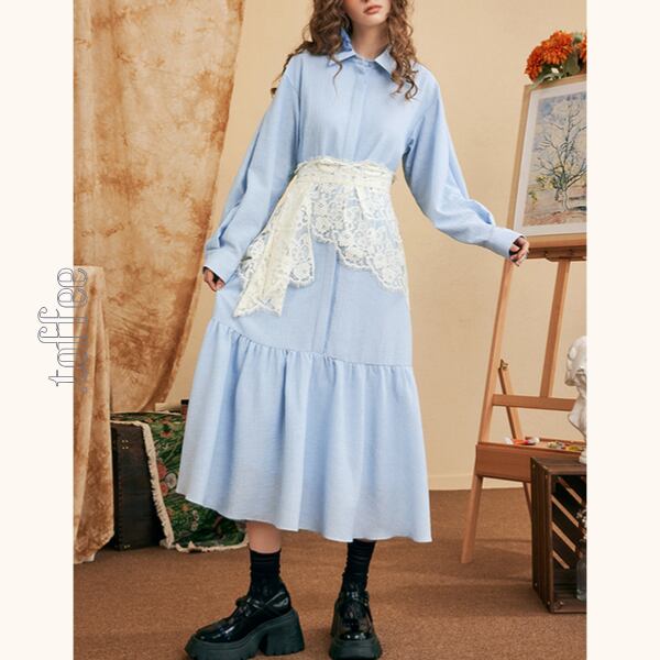 エレガンスと可愛らしさが融合したレースカラーブルーワンピース。