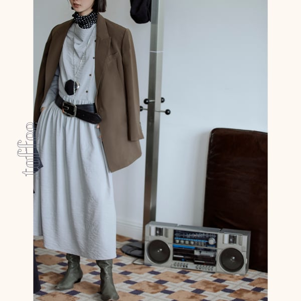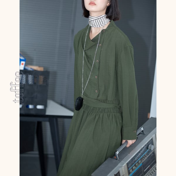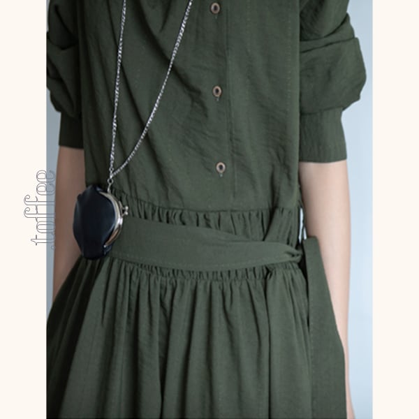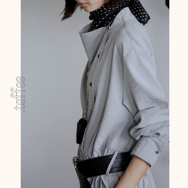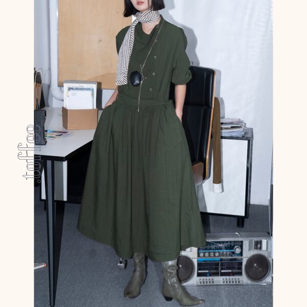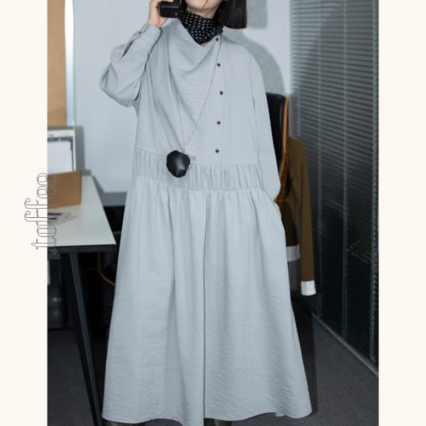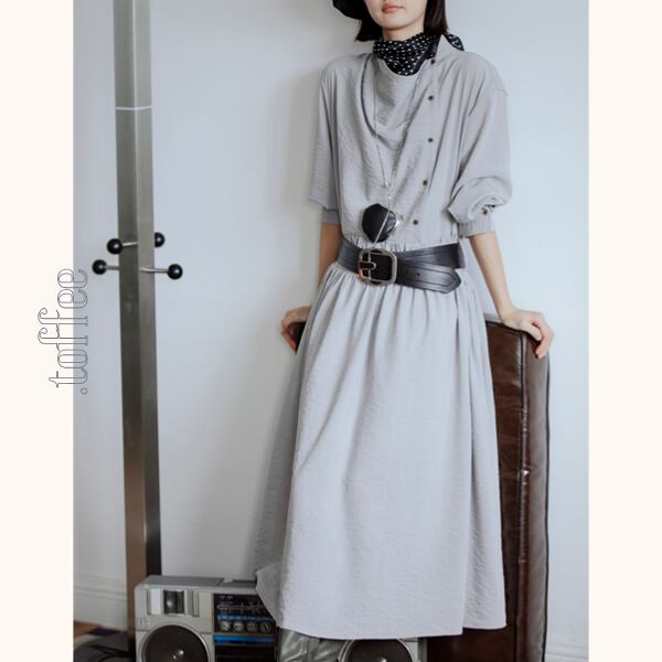 シンプルなデザインの中に、洗練された印象を与える斜め前立てロングワンピース。グレーとオリーブグリーンの2色展開で、あなたのコーディネートに深みを加えます。斜めの前立てが目を引き、特別感を演出。デイリーから特別なシーンまで、幅広く活躍する壱枚です。