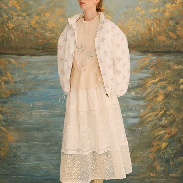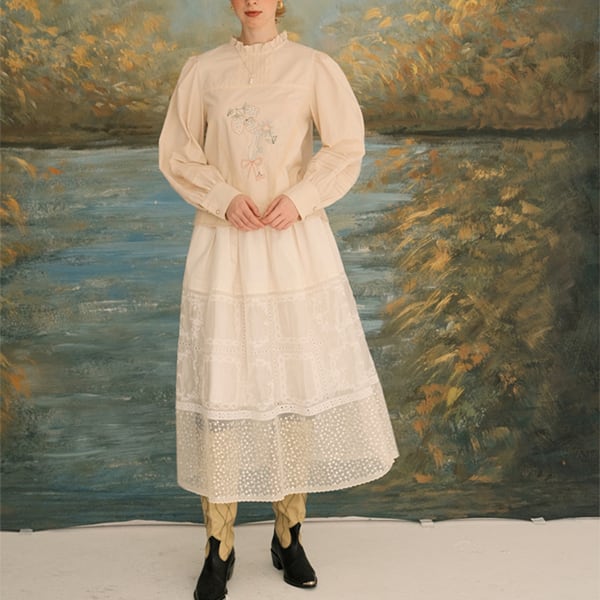 優雅なレースと繊細な刺繍が施されたコットンブラウス。