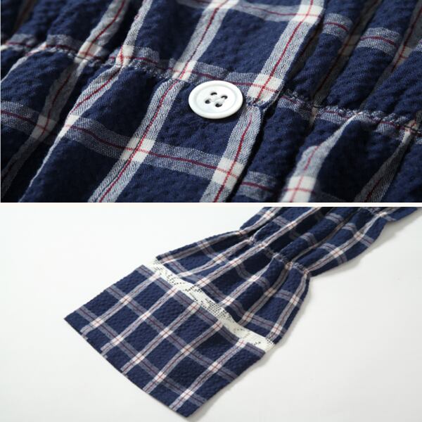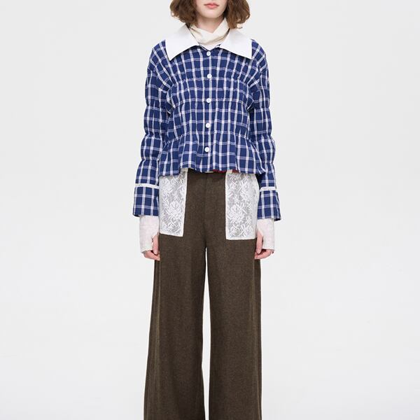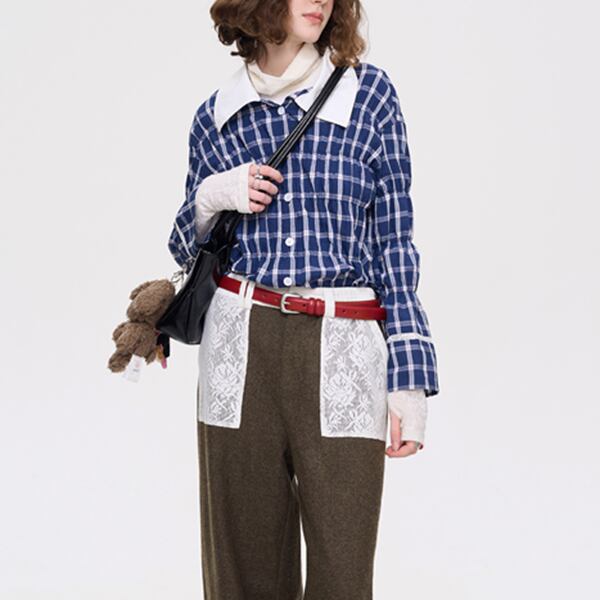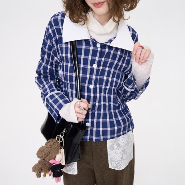 レースディテールが魅力的なチャック柄ブルーシャツです。