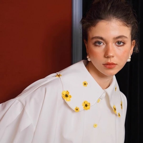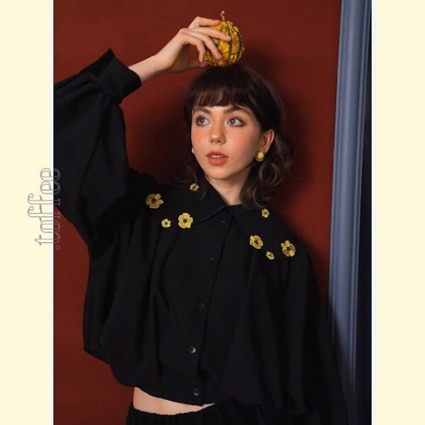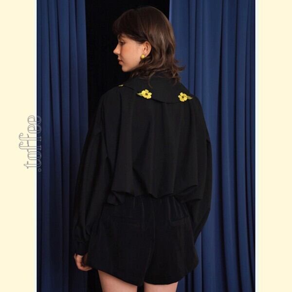 大きな丸襟に散りばめられた黄色のお花刺繍が、華やかさを一層引き立て、ショート丈でふわっと広がる立体的なシルエットが、デザイン性の高さを際立たせます。
