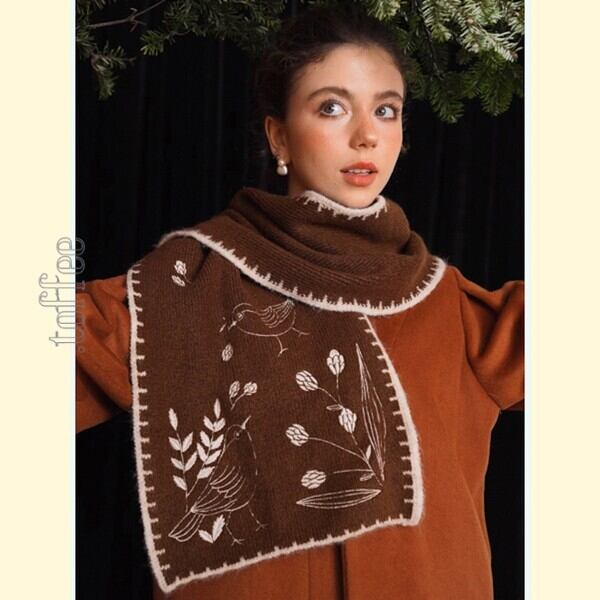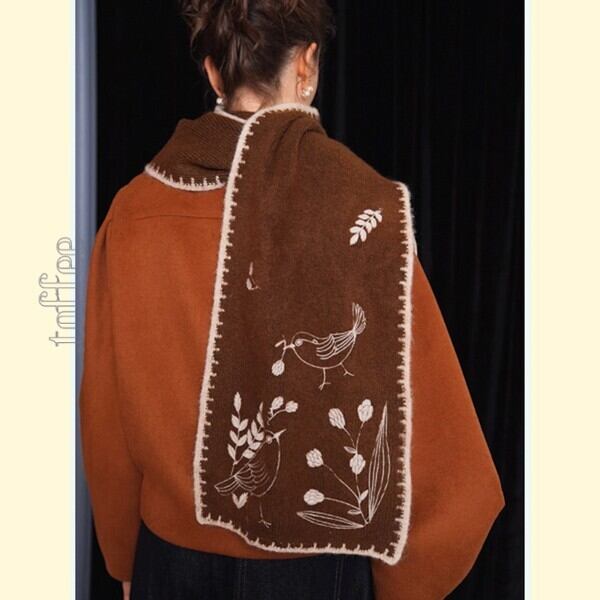 自然と夢が織りなす芸術的アクセサリー:鳥と植物刺繍のショール 《C0192》