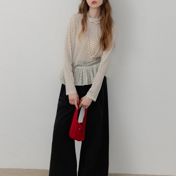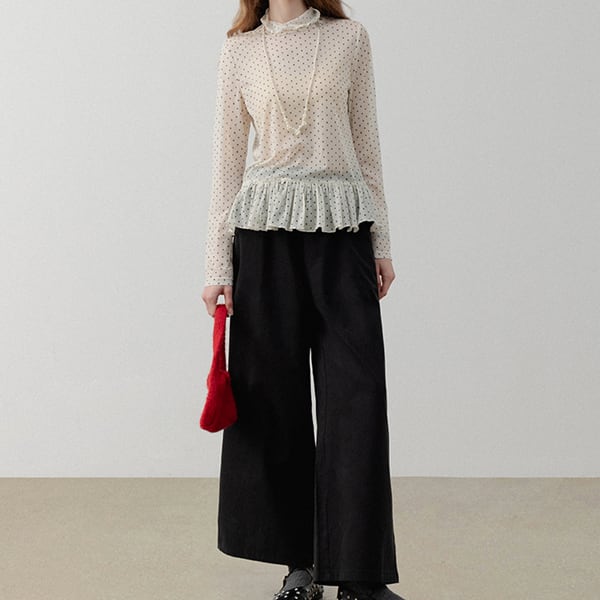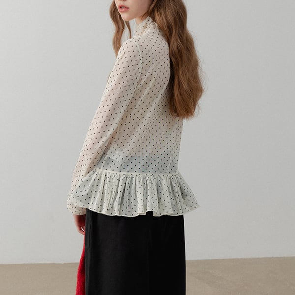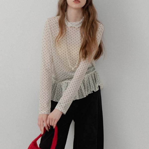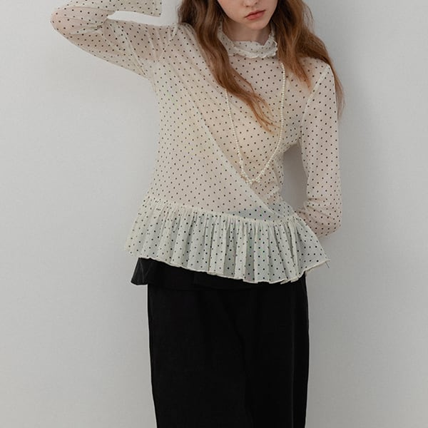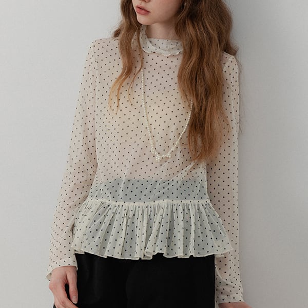 ドット柄が可愛いペプラムブラウス。透け感のある生地と、女性らしいペプラムデザインが、上品で華やかな印象を与えます。シンプルなボトムスと合わせるだけで、おしゃれな着こなしが完成します。デイリーユースはもちろん、デートや女子会など、様々なシーンで活躍してくれる一着です。