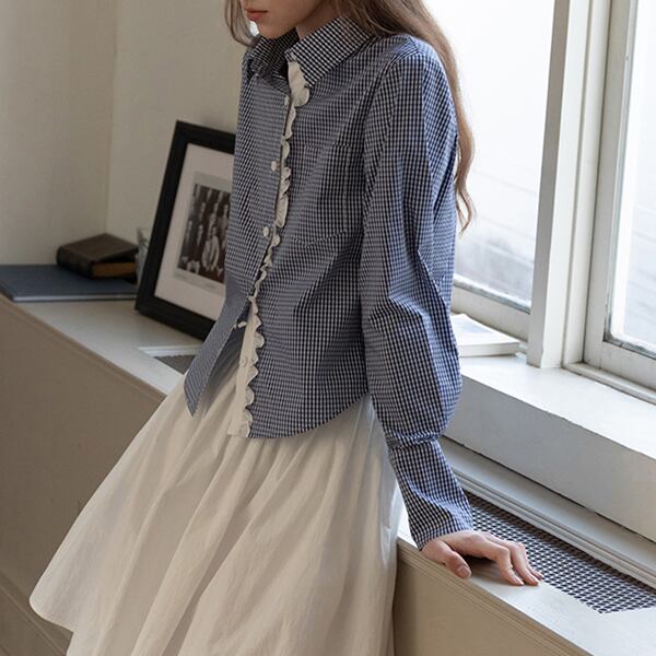 爽やかなギンガムチェック柄と、繊細なレースのディテールが魅力的なシャツです。